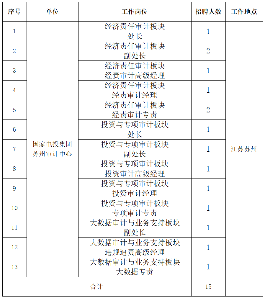 根據工作需要,現面向國家電投集團系統內公開選聘國家電投集團蘇州審計中心13個崗位、共計15人,具體事項公告如下: