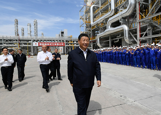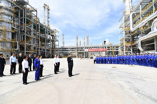 9月13日至14日,中共中央總書記、國家主席、中央軍委主席習近平在陜西省榆林市考察。這是13日上午,習近平在國家能源集團榆林化工有限公司年產40萬噸乙二醇項目現場考察。新華社記者 李學仁 攝